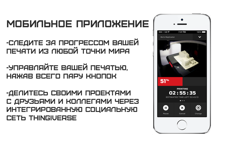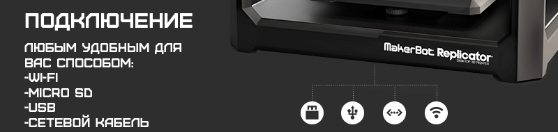 Отдельного внимание заслуживает наличие возможности загрузить данные об изделии в MakerBot Replicator Z18 различными способами: непосредственно с компьютера разработчика, чрез интернет или с любого флэш накопителя. Имеется мобильное приложение для дистанционного контроля процесса печати. Используемый материал допускает дальнейшую механическую обработку, что важно при необходимости выполнения тонких отверстий или нарезки резьбы.