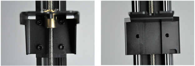 - В версии 1.5 используется система с двумя направляющими, в значительной степени уменьшающая вобблинг. Трапецеидальный винт, установленный по центру, обеспечивает лучшую фиксацию крепления по оси Z и помогает добиться совершенных результатов печати.