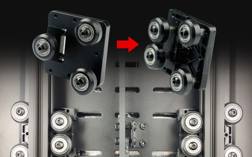 - Рельсовая направляющая по оси Y на 4-ех роликах (вместо 3-ех) – обеспечивает плавность движений.